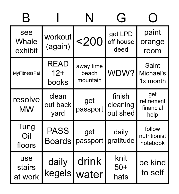 This bingo card has 25 words: PASS Boards, drink water, away time beach mountain, use stairs at work, paint orange room, see Whale exhibit, MyFitnessPal, workout (again), finish cleaning out shed, get passport, WDW?, resolve MW, daily gratitude, follow nutritionist notebook, READ 12+ books, be kind to self, get retirement financial help, <200, Saint Michael's 1x month, clean out back yard, get passport, daily kegels, Tung Oil floors, get LPD off house deed and knit 50+ hats.