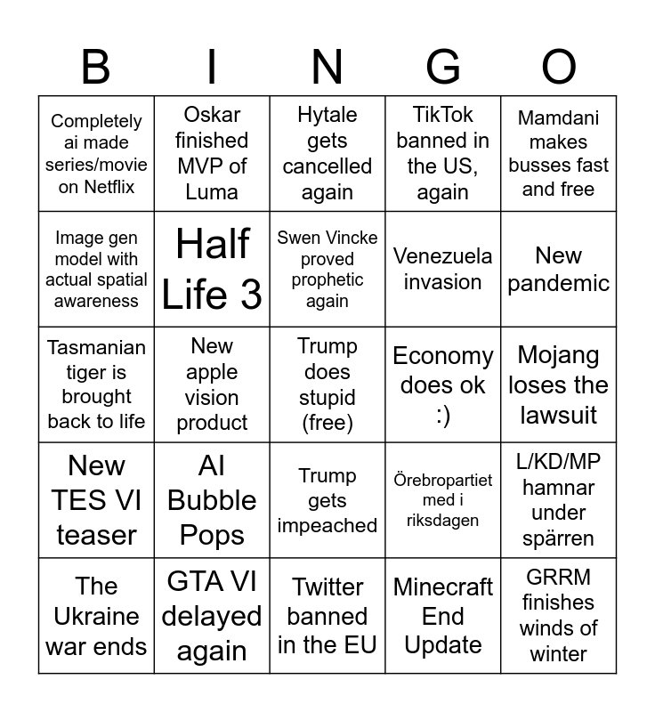 This bingo card has a free space and 24 words: AI Bubble Pops, GTA VI delayed again, Swen Vincke proved prophetic again, The Ukraine war ends, Mamdani makes busses fast and free, Completely ai made series/movie on Netflix, Image gen model with actual spatial awareness, Oskar finished MVP of Luma, Economy does ok :), Trump gets impeached, Venezuela invasion, Tasmanian tiger is brought back to life, Örebropartiet med i riksdagen, L/KD/MP hamnar under spärren, Half Life 3, Minecraft End Update, Mojang loses the lawsuit, Hytale gets cancelled again, New pandemic, New apple vision product, GRRM finishes winds of winter, New TES VI teaser, TikTok banned in the US, again and Twitter banned in the EU.