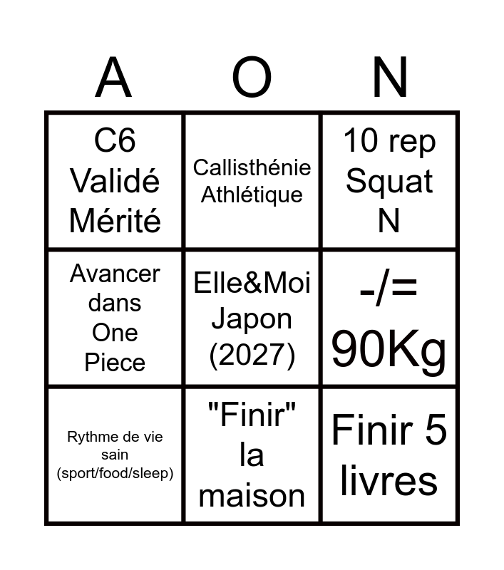 This bingo card has a free space and 8 words: -/= 90Kg, 10 rep Squat N, Callisthénie Athlétique, Rythme de vie sain (sport/food/sleep), C6 Validé Mérité, Finir 5 livres, Avancer dans One Piece and "Finir" la maison.