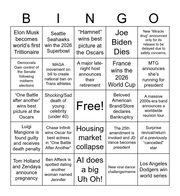This bingo card has a free space and 24 words: Chase Infiniti wins Oscar for best actress in “One Battle After Another”, Ben Affleck is spotted dating another woman named Jennifer, A major late-night host announces their retirement, Tom Holland and Zendaya announce pregnancy, New “Miracle drug” announced only for its release to be delayed due to safety concerns., Elon Musk becomes world’s first Trillionaire, Democrats Gain control of the Senate following midterm elections, Seattle Seahawks win the 2026 Superbowl, Beloved American Brand/Store declares Bankruptcy, Housing market collapse, France wins the 2026 World Cup, “One Battle after another” wins best picture at the Oscars, The 25th amendment is invoked and JD Vance becomes president, Surprise revival/return of a previously “cancelled” star, MAGA movement on bill to create national ban on Trans athletes, New viral dance challenge/meme, A massive 2000s-era band announces a worldwide reunion tour, “Hamnet” wins best picture at the Oscars, MTG announces she’s running for president, Shocking/Sad death of young celebrity (under 40), Los Angeles Dodgers win world series, Luigi Mangione is found guilty and receives death penalty, Joe Biden Dies and AI does a big Uh Oh!.