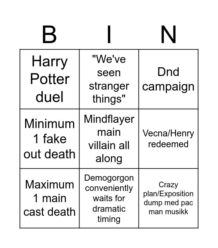 This bingo card has a free space and 8 words: Vecna/Henry redeemed, Dnd campaign, "We've seen stranger things", Maximum 1 main cast death, Harry Potter duel, Crazy plan/Exposition dump med pac man musikk, Minimum 1 fake out death and Demogorgon conveniently waits for dramatic timing.