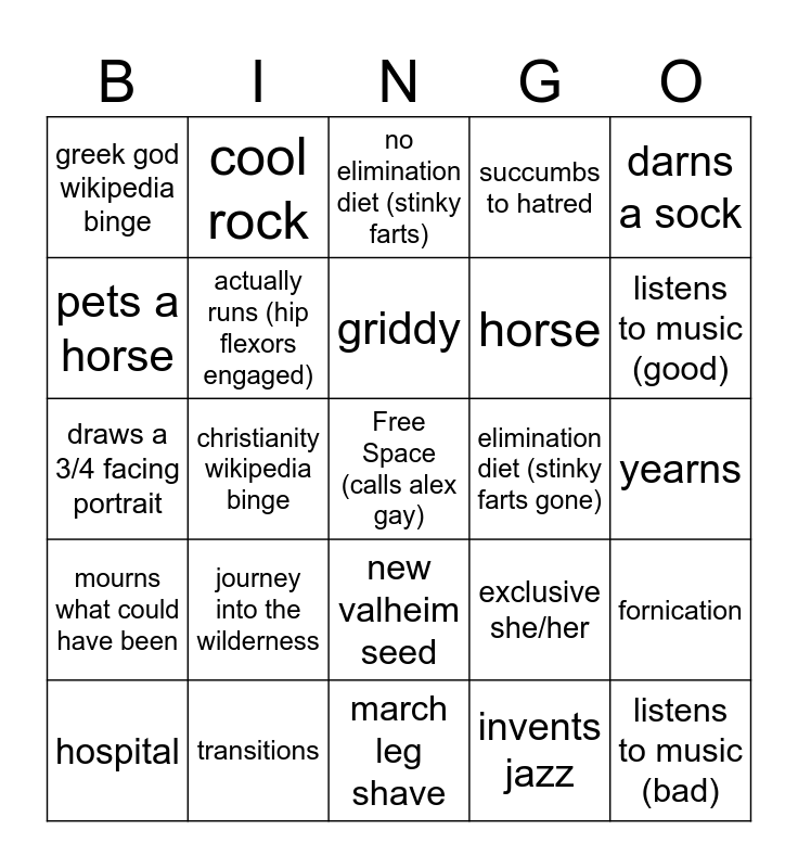 This bingo card has a free space and 24 words: journey into the wilderness, transitions, griddy, hospital, darns a sock, greek god wikipedia binge, pets a horse, cool rock, elimination diet (stinky farts gone), new valheim seed, horse, draws a 3/4 facing portrait, exclusive she/her, fornication, actually runs (hip flexors engaged), invents jazz, yearns, no elimination diet (stinky farts), listens to music (good), christianity wikipedia binge, listens to music (bad), mourns what could have been, succumbs to hatred and march leg shave.