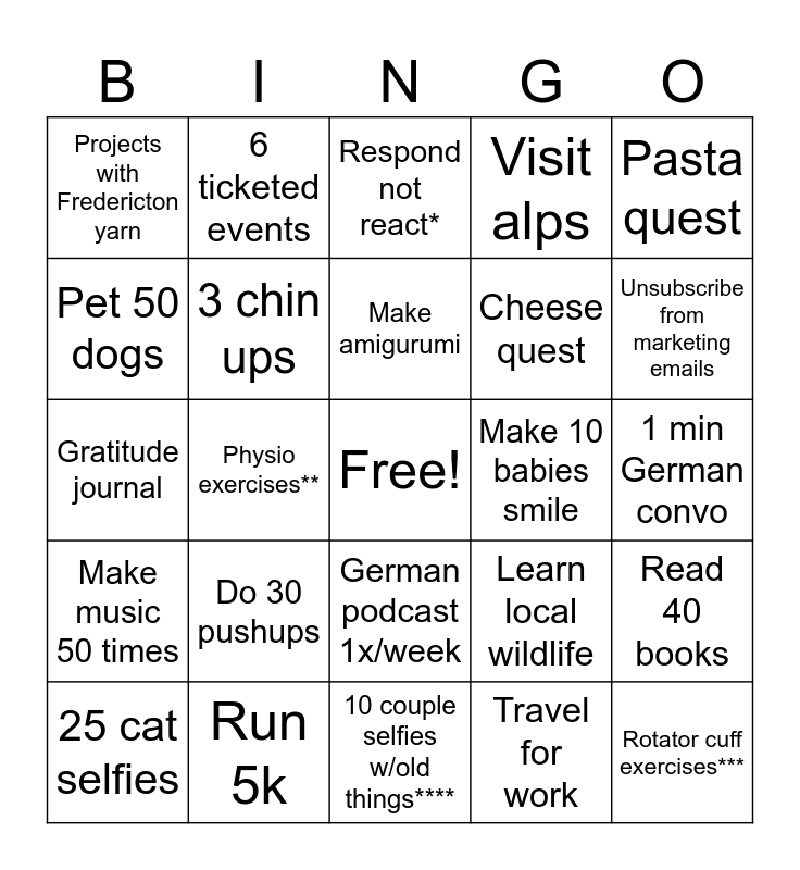 This bingo card has a free space and 24 words: Do 30 pushups, Run 5k, Make amigurumi, 25 cat selfies, Pasta quest, Projects with Fredericton yarn, Pet 50 dogs, 6 ticketed events, Make 10 babies smile, German podcast 1x/week, Cheese quest, Gratitude journal, Learn local wildlife, Read 40 books, 3 chin ups, Travel for work, 1 min German convo, Respond not react*, Unsubscribe from marketing emails, Physio exercises**, Rotator cuff exercises***, Make music 50 times, Visit alps and 10 couple selfies w/old things****.