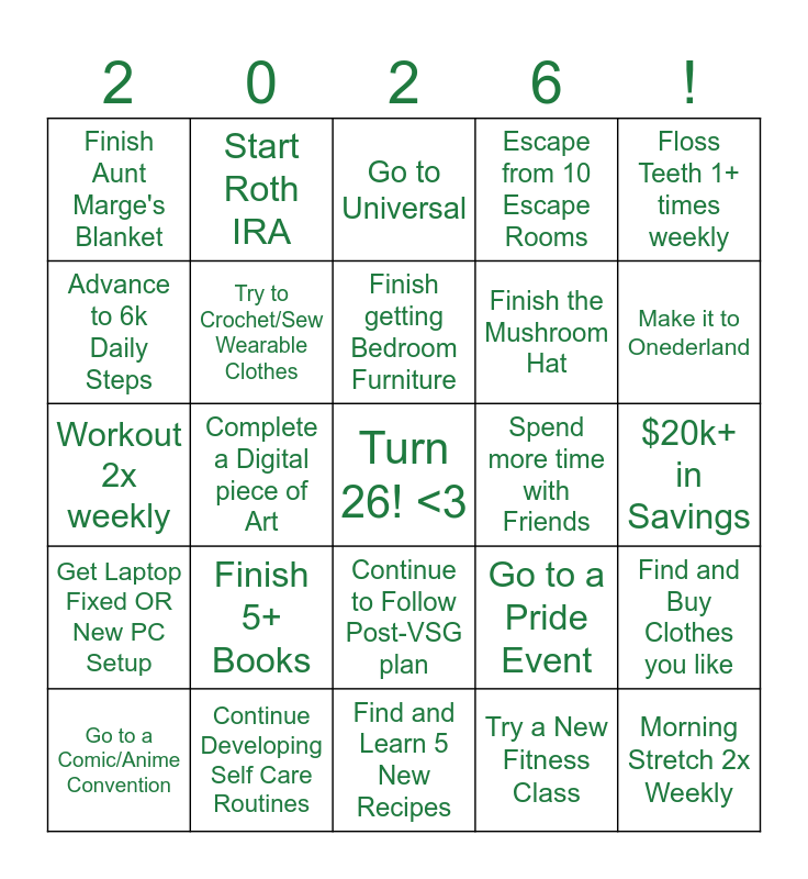 This bingo card has a free space and 24 words: Finish 5+ Books, Continue Developing Self Care Routines, Finish getting Bedroom Furniture, Go to a Comic/Anime Convention, Floss Teeth 1+ times weekly, Finish Aunt Marge's Blanket, Advance to 6k Daily Steps, Start Roth IRA, Spend more time with Friends, Continue to Follow Post-VSG plan, Finish the Mushroom Hat, Workout 2x weekly, Go to a Pride Event, Find and Buy Clothes you like, Try to Crochet/Sew Wearable Clothes, Try a New Fitness Class, $20k+ in Savings, Go to Universal, Make it to Onederland, Complete a Digital piece of Art, Morning Stretch 2x Weekly, Get Laptop Fixed OR New PC Setup, Escape from 10 Escape Rooms and Find and Learn 5 New Recipes.