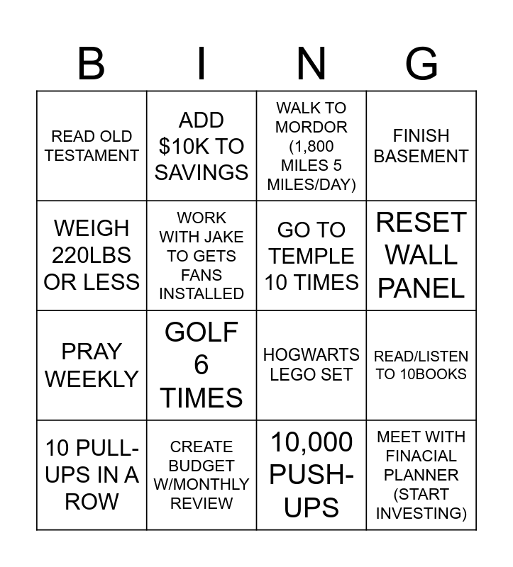 This bingo card has 16 words: CREATE BUDGET W/MONTHLY REVIEW, READ/LISTEN TO 10BOOKS, WALK TO MORDOR (1,800 MILES 5 MILES/DAY), READ OLD TESTAMENT, PRAY WEEKLY, ADD $10K TO SAVINGS, HOGWARTS LEGO SET, 10,000 PUSH-UPS, WEIGH 220LBS OR LESS, WORK WITH JAKE TO GETS FANS INSTALLED, 10 PULL-UPS IN A ROW, FINISH BASEMENT, GOLF 6 TIMES, RESET WALL PANEL, GO TO TEMPLE 10 TIMES and MEET WITH FINACIAL PLANNER (START INVESTING).