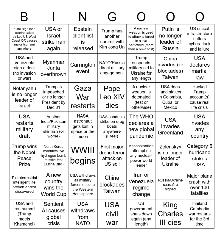 This bingo card has a free space and 48 words: Iran or Venezuela regime change, China invades (or blockades) Taiwan, USA civil war, Another India/Pakistan military skirmish (or worse), Gaza War restarts, USA invades any country, USA or Israel strike Iran again, Sentient AI causes global crisis, Putin is no longer leader of Russia, First major drone terror attack on US soil, US critical infrastructure suffers cyberattack and failure, Trump has another summit with Kim Jong Un, USA does land strikes in Colombia, Cuba, or Mexico, A nuclear weapon is detonated (test or otherwise), Extraterrestrial intelligent life proven and/or discovered, USA invades Greenland, USA and Venezuela sign a deal (no invasion or war), USA declares martial law, Russia/Ukraine ceasefire signed, A nuclear weapon is used to attack a target in a live battlefield (more than a nuke test), Trump suspends military aid to Ukraine for any length, NASA astronaut gets lost in space or the moon, "The Big One" (earthquake) strikes US West Coast OR causes major tsunami anywhere, Myanmar Junta overthrown, Major plane crash with over 100 fatalities, Carrington event, Hacked Trump account(s) cause real life crisis, USA and Iran summit (Trump meets Khamenei), Pope Leo XIV dies, Trump is impeached or no longer President by Dec 31, King Charles III dies, The WHO declares a new global pandemic, Category 5 hurricane strikes USA, A new country wins the World Cup, USA restarts military draft, Assassination attempt on any nuclear-power world leader, Zelenskyy is no longer leader of Ukraine, Netanyahu is no longer leader of Israel, WWIII begins, USA withdraws all military forces outside the Western Hemisphere, Trump wins the Nobel Peace Prize, Thailand-Cambodia war restarts for the 3rd time, Epstein client list is released, USA withdraws from NATO, NATO/Russia direct military engagement, China blockades Taiwan, North Korea conducts live hydrogen bomb missile test (Juche Bird) and US government shuts down again (any length).