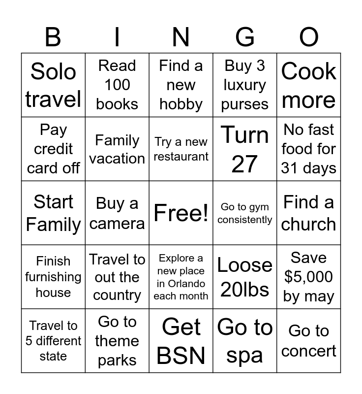 This bingo card has a free space and 24 words: Travel to 5 different state, Travel to out the country, Try a new restaurant, Go to spa, Cook more, Solo travel, Read 100 books, Find a new hobby, Go to gym consistently, Find a church, Start Family, Family vacation, Loose 20lbs, Save $5,000 by may, Pay credit card off, Go to theme parks, Get BSN, Buy 3 luxury purses, No fast food for 31 days, Finish furnishing house, Buy a camera, Explore a new place in Orlando each month, Turn 27 and Go to concert.