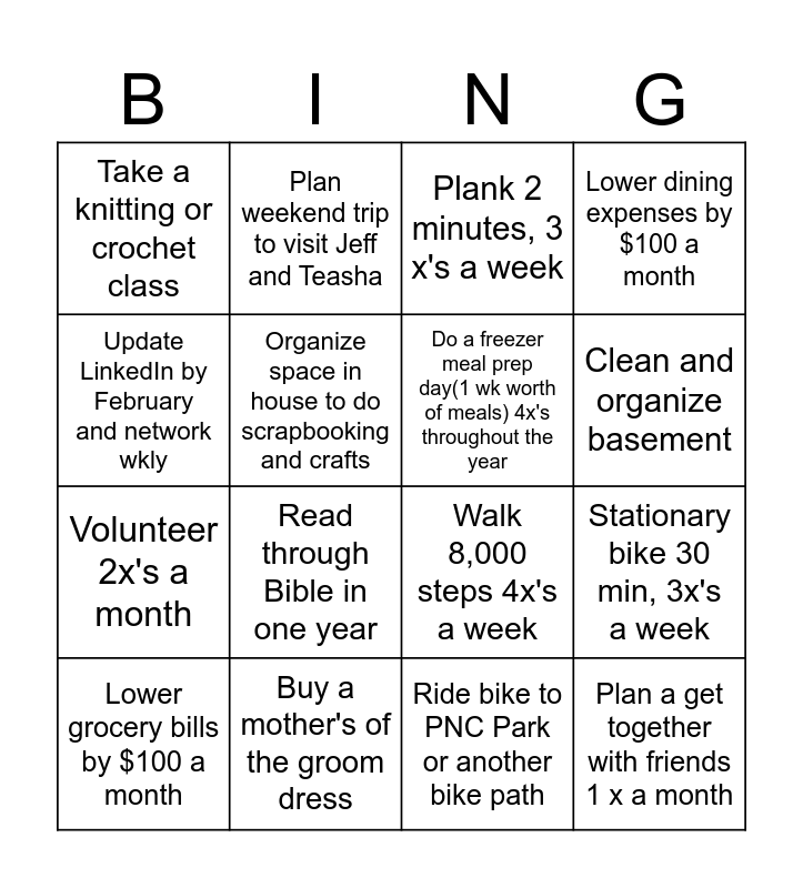 This bingo card has 16 words: Buy a mother's of the groom dress, Stationary bike 30 min, 3x's a week, Plank 2 minutes, 3 x's a week, Take a knitting or crochet class, Volunteer 2x's a month, Plan weekend trip to visit Jeff and Teasha, Walk 8,000 steps 4x's a week, Ride bike to PNC Park or another bike path, Update LinkedIn by February and network wkly, Organize space in house to do scrapbooking and crafts, Lower grocery bills by $100 a month, Lower dining expenses by $100 a month, Read through Bible in one year, Clean and organize basement, Do a freezer meal prep day(1 wk worth of meals) 4x's throughout the year and Plan a get together with friends 1 x a month.