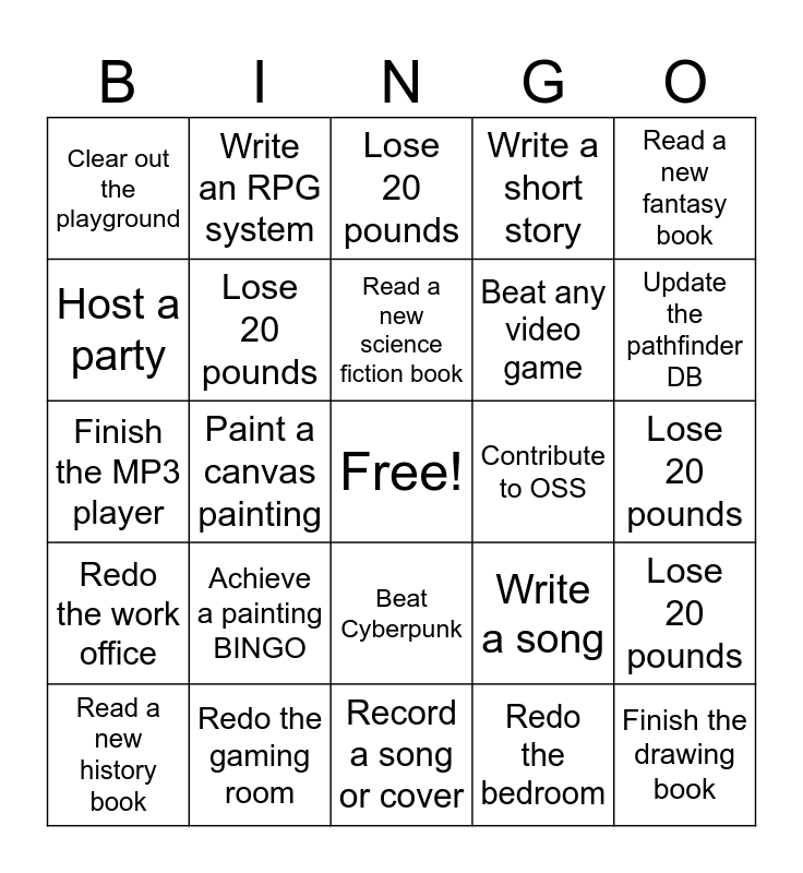 This bingo card has a free space and 25 words: Achieve a painting BINGO, Record a song or cover, Read a new science fiction book, Read a new history book, Read a new fantasy book, Clear out the playground, Host a party, Write an RPG system, Contribute to OSS, Beat Cyberpunk, Beat any video game, Finish the MP3 player, Write a song, Lose 20 pounds, Lose 20 pounds, Lose 20 pounds, Lose 20 pounds, Lose 20 pounds, Update the pathfinder DB, Paint a canvas painting, Finish the drawing book, Redo the gaming room, Redo the work office, Write a short story and Redo the bedroom.
