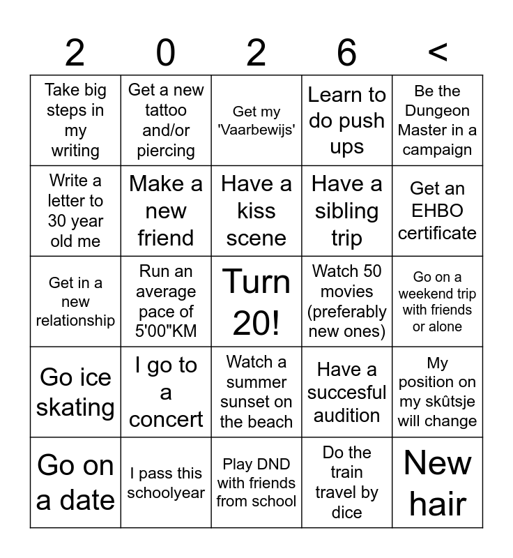 This bingo card has a free space and 24 words: I go to a concert, I pass this schoolyear, Have a kiss scene, Go on a date, Be the Dungeon Master in a campaign, Take big steps in my writing, Write a letter to 30 year old me, Get a new tattoo and/or piercing, Watch 50 movies (preferably new ones), Watch a summer sunset on the beach, Have a sibling trip, Get in a new relationship, Have a succesful audition, My position on my skûtsje will change, Make a new friend, Do the train travel by dice, Go on a weekend trip with friends or alone, Get my 'Vaarbewijs', Get an EHBO certificate, Run an average pace of 5'00"KM, New hair, Go ice skating, Learn to do push ups and Play DND with friends from school.