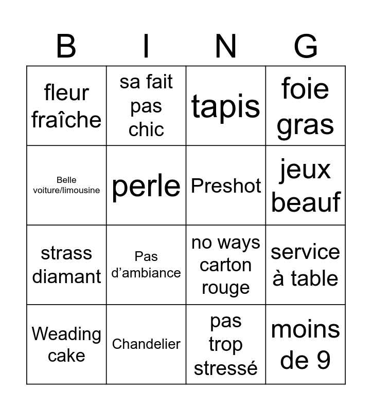 This bingo card has 16 words: Chandelier, service à table, tapis, fleur fraîche, strass diamant, sa fait pas chic, no ways carton rouge, pas trop stressé, Belle voiture/limousine, perle, Weading cake, foie gras, Pas d’ambiance, jeux beauf, Preshot and moins de 9.