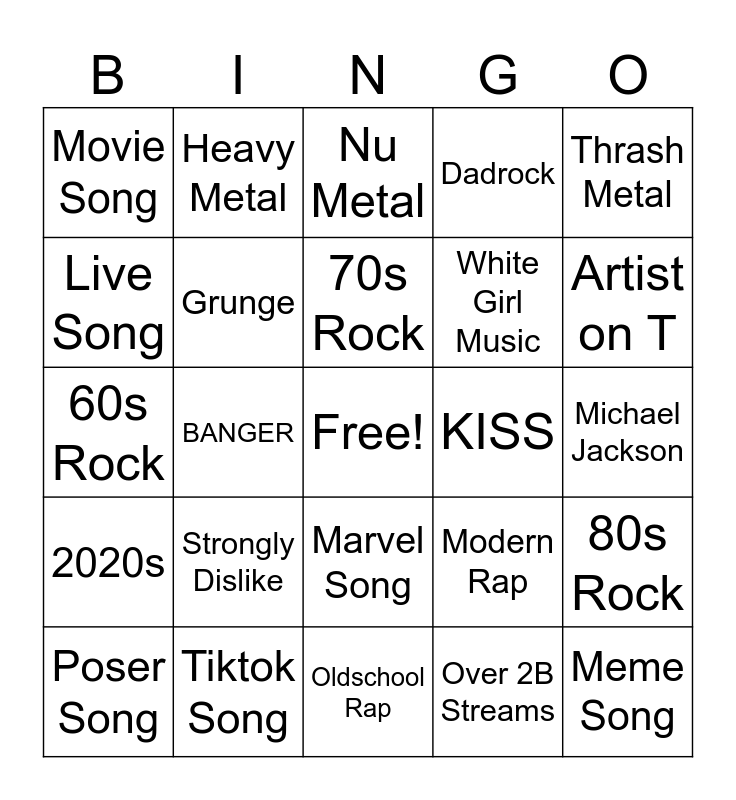 This bingo card has a free space and 24 words: Strongly Dislike, Tiktok Song, 70s Rock, Poser Song, Thrash Metal, Movie Song, Live Song, Heavy Metal, KISS, Marvel Song, White Girl Music, 60s Rock, Modern Rap, 80s Rock, Grunge, Over 2B Streams, Michael Jackson, Nu Metal, Artist on T, BANGER, Meme Song, 2020s, Dadrock and Oldschool Rap.