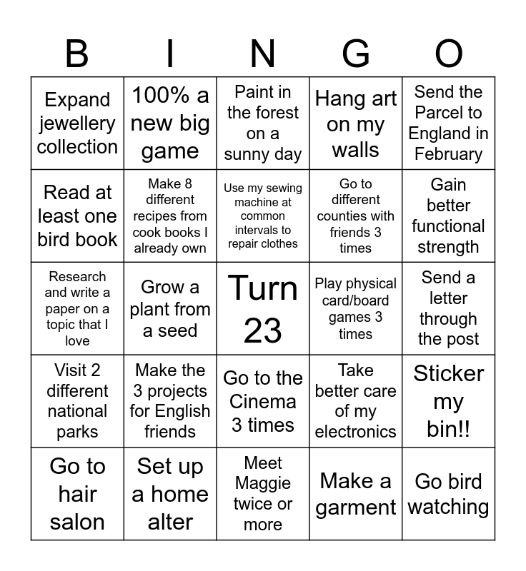 This bingo card has a free space and 24 words: Make the 3 projects for English friends, Set up a home alter, Use my sewing machine at common intervals to repair clothes, Go to hair salon, Send the Parcel to England in February, Expand jewellery collection, Read at least one bird book, 100% a new big game, Play physical card/board games 3 times, Go to the Cinema 3 times, Go to different counties with friends 3 times, Research and write a paper on a topic that I love, Take better care of my electronics, Sticker my bin!!, Make 8 different recipes from cook books I already own, Make a garment, Send a letter through the post, Paint in the forest on a sunny day, Gain better functional strength, Grow a plant from a seed, Go bird watching, Visit 2 different national parks, Hang art on my walls and Meet Maggie twice or more.