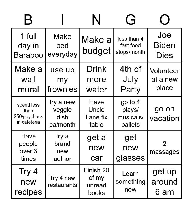 This bingo card has 25 words: try a brand new author, Finish 20 of my unread books, Drink more water, Try 4 new recipes, Joe Biden Dies, 1 full day in Baraboo, Make a wall mural, Make bed everyday, go to 4 plays/ musicals/ ballets, get a new car, 4th of July Party, spend less than $50/paycheck in cafeteria, get new glasses, 2 massages, use up my frownies, get up around 6 am, go on vacation, Make a budget, Volunteer at a new place, try a new veggie dish ea/month, Have Uncle Lane fix table, Try 4 new restaurants, Have people over 3 times, less than 4 fast food stops/month and Learn something new.