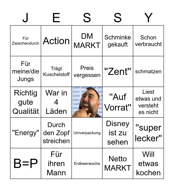 This bingo card has a free space and 24 words: Durch den Zopf streichen, Für ihren Mann, Preis vergessen, B=P, Schon verbraucht, Für Zwischendurch, Für meine/die Jungs, Action, ''Auf Vorrat'', Umverpackung, ''Zent'', Richtig gute Qualität, Disney ist zu sehen, ''super lecker'', Trägt Kuschelstoff, Netto MARKT, Liest etwas und versteht es nicht, DM MARKT, schmatzen, War in 4 Läden, Will etwas kochen, ''Energy'', Schminke gekauft and Erdbeerwoche.