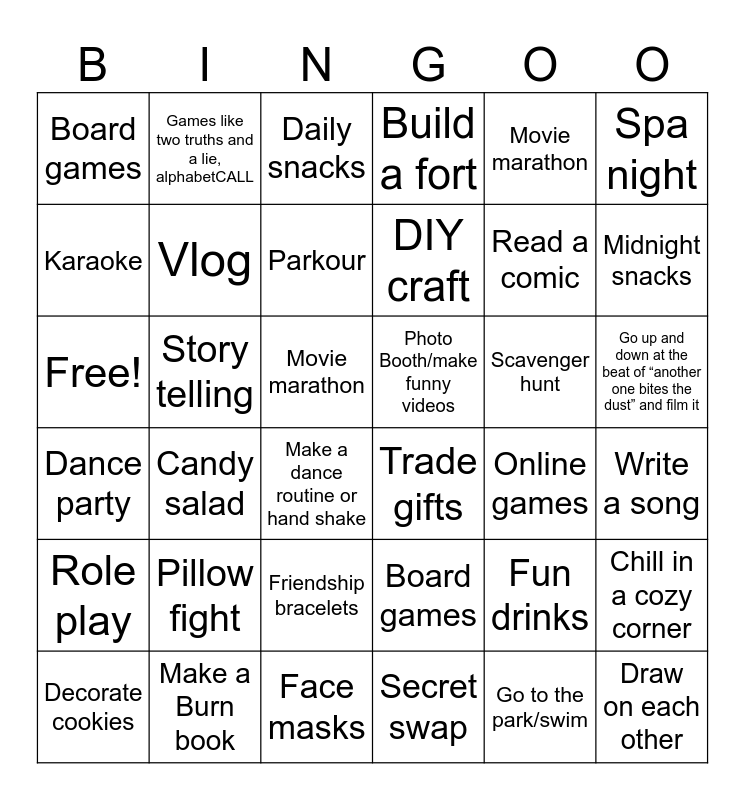 This bingo card has 36 words: Board games, Friendship bracelets, Secret swap, Karaoke, Dance party, Photo Booth/make funny videos, Vlog, Face masks, Movie marathon, Fun drinks, Midnight snacks, Build a fort, Chill in a cozy corner, Story telling, DIY craft, Board games, Role play, Scavenger hunt, Free!, Daily snacks, Movie marathon, Candy salad, Trade gifts, Make a dance routine or hand shake, Online games, Games like two truths and a lie, alphabetCALL, Read a comic, Make a Burn book, Parkour, Spa night, Draw on each other, Decorate cookies, Write a song, Go up and down at the beat of “another one bites the dust” and film it, Pillow fight and Go to the park/swim.