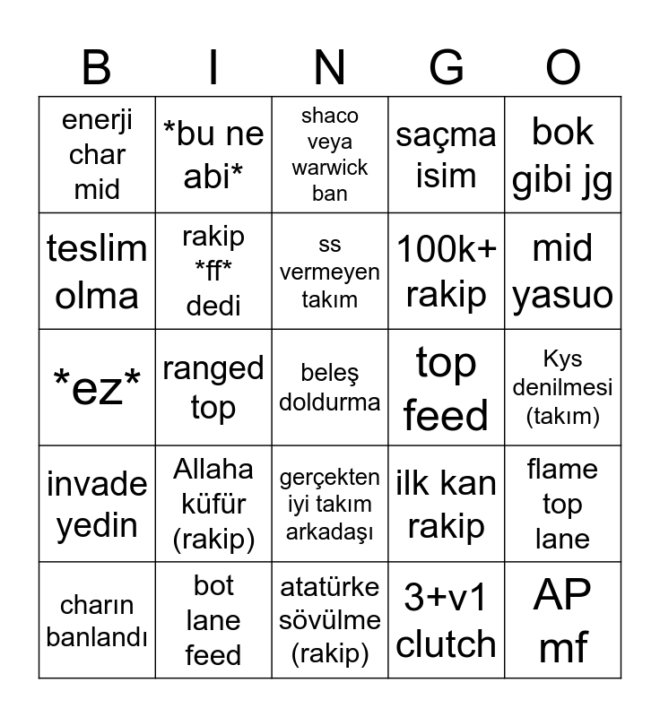 This bingo card has a free space and 24 words: Allaha küfür (rakip), bot lane feed, ss vermeyen takım, charın banlandı, bok gibi jg, enerji char mid, teslim olma, *bu ne abi*, top feed, gerçekten iyi takım arkadaşı, 100k+ rakip, *ez*, ilk kan rakip, flame top lane, rakip *ff* dedi, 3+v1 clutch, Kys denilmesi (takım), shaco veya warwick ban, mid yasuo, ranged top, AP mf, invade yedin, saçma isim and atatürke sövülme (rakip).
