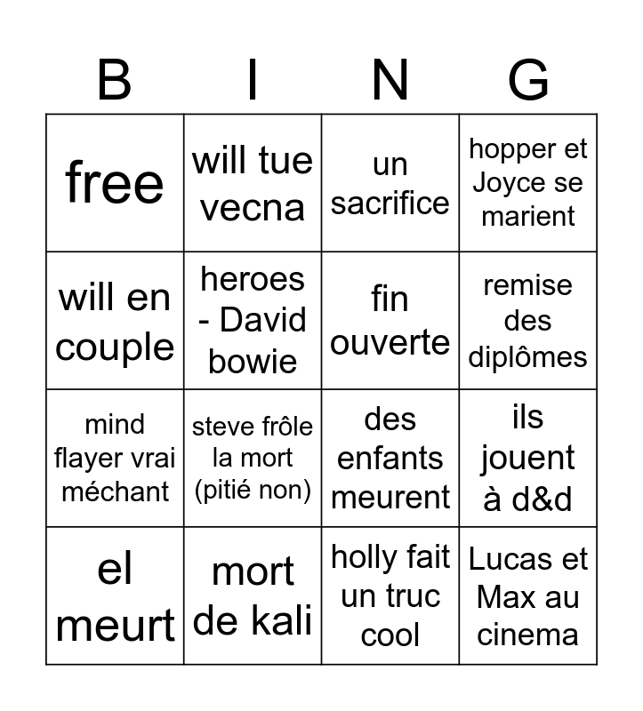 This bingo card has 16 words: mort de kali, ils jouent à d&d, un sacrifice, free, mind flayer vrai méchant, will tue vecna, des enfants meurent, holly fait un truc cool, will en couple, heroes - David bowie, el meurt, hopper et Joyce se marient, steve frôle la mort (pitié non), remise des diplômes, fin ouverte and Lucas et Max au cinema.