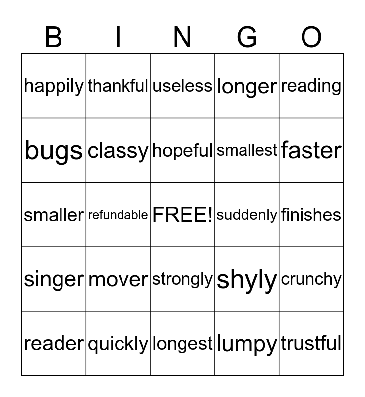 This bingo card has a free space and 24 words: mover, quickly, hopeful, reader, reading, happily, bugs, thankful, suddenly, strongly, smallest, smaller, shyly, crunchy, classy, lumpy, finishes, useless, faster, refundable, trustful, singer, longer and longest.