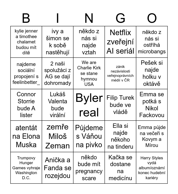 This bingo card has a free space and 24 words: zemře Miloš Zeman, Anička a Fanda se rozejdou, We are Charlie Kirk se stane hymnou USA, Trumpovy Hunger Games vyhraje Washington D.C., někdo z nás si ostříhá microbangs, kylie jenner a timothee chalamet budou mít dítě, najdeme sociální propojení s feelinbetter_, ivy a šimon se k sobě nastěhují, Filip Turek bude ve vládě, Půjdeme s Váňou na pivko, zánik nezávislosti veřejnoprávních médií v ČR, Connor Storrie bude A lister, Ella si najde někoho na tinderu, Emma půjde na večeři s Kovym a Mírou, 2 naši spolužáci z AG se dají dohromady, Kačka se dostane na medicínu, Emma se potká s Nikol Fackovou, někdo z nás si najde vztah, Pešek si najde holku v oktávě, Lukáš Valenta bude virální, Harry Styles vydá album/oznámí konec hudební kariéry, atentát na Elona Muska, Netflix zveřejní AI seriál and někdo bude mít pregnancy scare.