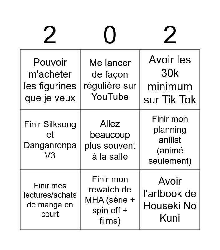 This bingo card has a free space and 8 words: Finir mon planning anilist (animé seulement), Avoir les 30k minimum sur Tik Tok, Me lancer de façon régulière sur YouTube, Finir mes lectures/achats de manga en court, Pouvoir m'acheter les figurines que je veux, Avoir l'artbook de Houseki No Kuni, Finir Silksong et Danganronpa V3 and Finir mon rewatch de MHA (série + spin off + films).