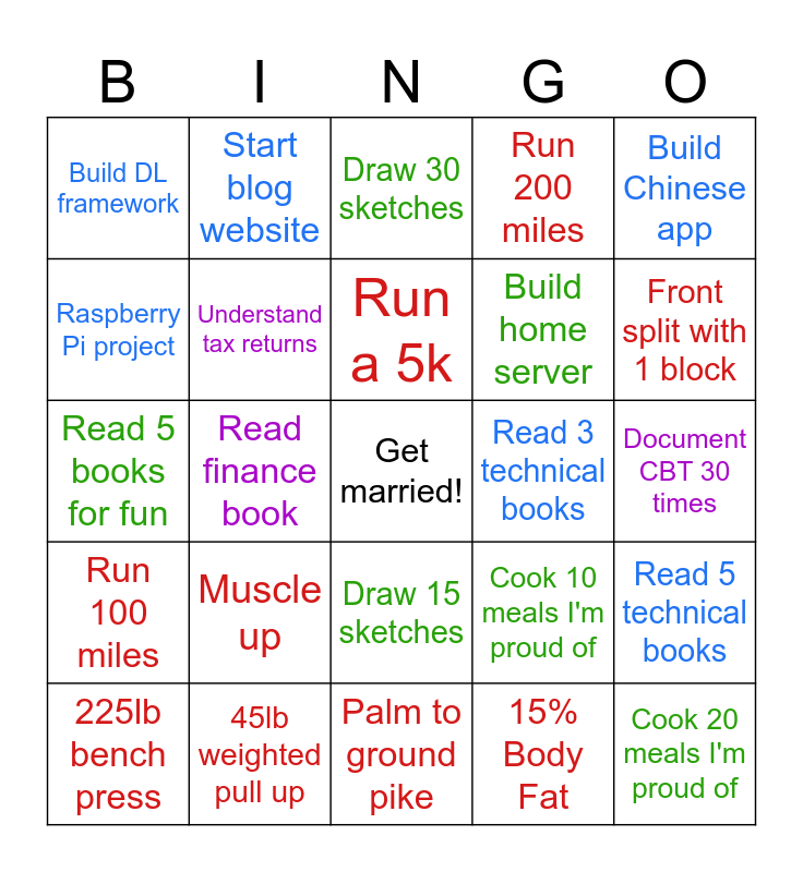 This bingo card has a free space and 24 words: Muscle up, 45lb weighted pull up, Run a 5k, 225lb bench press, Build Chinese app, Build DL framework, Raspberry Pi project, Start blog website, Read 3 technical books, Draw 15 sketches, Build home server, Read 5 books for fun, Cook 10 meals I'm proud of, Read 5 technical books, Understand tax returns, 15% Body Fat, Document CBT 30 times, Draw 30 sketches, Front split with 1 block, Read finance book, Cook 20 meals I'm proud of, Run 100 miles, Run 200 miles and Palm to ground pike.