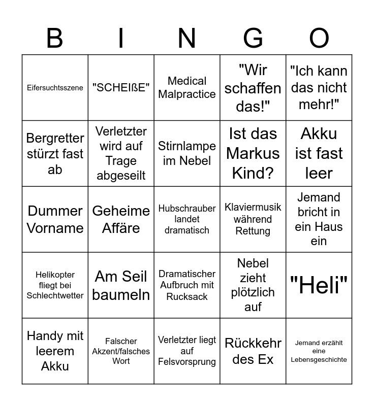 This bingo card has 48 words: Lawine!, Hubschrauber landet dramatisch, "Ich geh alleine weiter.", Verletzter liegt auf Felsvorsprung, Am Seil baumeln, "Ich hab kein Netz!", "SCHEIßE", Streit in der Familie, Bergretter stürzt fast ab, Beichte auf dem Gipfel, Verletzter wird auf Trage abgeseilt, "Wir schaffen das!", "Heli", Nebel zieht plötzlich auf, Konfrontation am Berg, Handy fällt in die Schlucht, Stirnlampe im Nebel, Klaviermusik während Rettung, Misstrauisches Familienmitglied, "Ich kann das nicht mehr!", Geheime Affäre, Rückkehr des Ex, Eifersuchtsszene, Ist das Markus Kind?, Jemand macht etwas extrem Dummes, Akku ist fast leer, Handy mit leerem Akku, Schweigeminute mit Musik, Dramatischer Aufbruch mit Rucksack, Helikopter fliegt bei Schlechtwetter, Mia being cute, Marks streitet mit den Bergrettern, Das ist illegal!/Ist das illegal?, Beef zwischen Peter und Franz, Falscher Akzent/falsches Wort, Familiendrama, Viel zu wenig Personal, Jemand bricht in ein Haus ein, Verliebter Blick, "Taubergung", Markus übernimmt die Polizeiarbeit, Jemand erzählt eine Lebensgeschichte, Medical Malpractice, "(Jessica) Pollat Polizei (Schladming)", Dummer Vorname, "Markus Kofler Bergrettung Ramsau", Unnötiger Helikopterflug and Verena ist das Krankenhaus.
