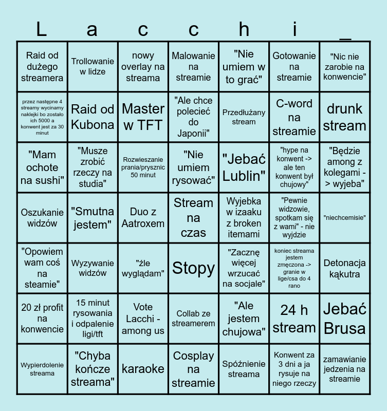 This bingo card has a free space and 48 words: "Ale jestem chujowa", C-word na streamie, Cosplay na streamie, "Smutna jestem", Rozwieszanie prania/prysznic 50 minut, "niechcemisie", Trollowanie w lidze, "Chyba kończe streama", Gotowanie na streamie, Stopy, "Nic nie zarobie na konwencie", Malowanie na streamie, "hype na konwent -> ale ten konwent był chujowy", "Jebać Lublin", 20 zł profit na konwencie, "Pewnie widzowie, spotkam się z wami" - nie wyjdzie, przez następne 4 streamy wycinamy naklejki bo zostało ich 5000 a konwent jest za 30 minut, drunk stream, 24 h stream, "Nie umiem w to grać", Przedłużany stream, Duo z Aatroxem, Raid od dużego streamera, Raid od Kubona, Jebać Brusa, Master w TFT, "Będzie among z kolegami -> wyjeba", Wypierdolenie streama, "Nie umiem rysować", "Musze zrobić rzeczy na studia", Konwent za 3 dni a ja rysuje na niego rzeczy, Wyjebka w izaaku z broken itemami, Detonacja kąkutra, 15 minut rysowania i odpalenie ligi/tft, Oszukanie widzów, "Zacznę więcej wrzucać na socjale", koniec streama jestem zmęczona -> granie w lige/csa do 4 rano, "Mam ochote na sushi", "źle wyglądam", Vote Lacchi - among us, "Opowiem wam coś na steamie", zamawianie jedzenia na streamie, nowy overlay na streama, karaoke, "Ale chce polecieć do Japonii", Collab ze streamerem, Wyzywanie widzów and Spóźnienie streama.