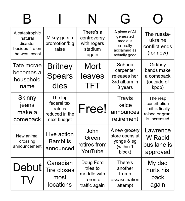 This bingo card has a free space and 24 words: Debut TV, Live action Bambi is announced, Mort leaves TFT, There's another trump assassination attempt, The russia-ukraine conflict ends (for now), A catastrophic natural disaster besides fire on the west coast, Mikey gets a promotion/big raise, There's a controversy with rogers stadium again, Travis kelce announces retirement, The resp contribution limit is finally raised or grant is increased, Skinny jeans make a comeback, Britney Spears dies, A new grocery store opens at yonge & eg (within 1 block), Lawrence W Rapid bus lane is approved, Tate mcrae becomes a household name, Canadian Tire closes most locations, Doug Ford tries to meddle with Toronto traffic again, A piece of AI generated media is critically acclaimed as actually good, Girl/boy bands make a comeback (outside of kpop), New animal crossing announcement, The top federal tax rate is reduced in the next budget, John Green retires from YouTube, Sabrina carpenter releases her 3rd album in 3 years and My dad hurts his back again.