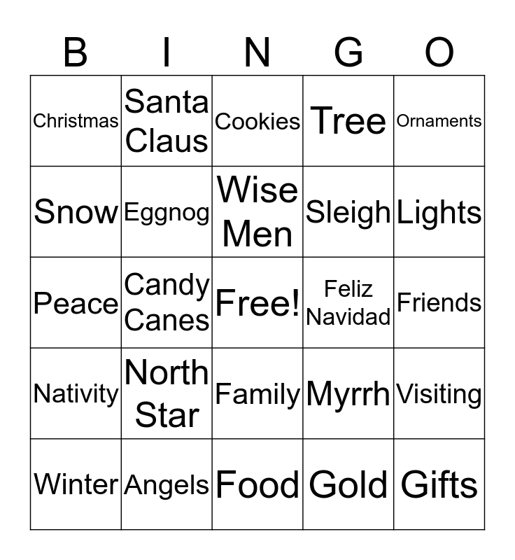 This bingo card has a free space and 30 words: Angels, Bethlehem, Candy Canes, Caroling, Christmas, Cookies, Eggnog, Family, Feliz Navidad, Food, Friends, Gifts, Gold, Holidays, Lights, Love, Myrrh, Nativity, North Star, Ornaments, Peace, Rudolph, Santa Claus, Sleigh, Snow, Tree, Visiting, Winter, Wise Men and Wreath.