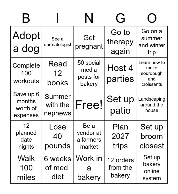 This bingo card has a free space and 24 words: Lose 40 pounds, 6 weeks of med. diet, 50 social media posts for bakery, Walk 100 miles, Go on a summer and winter trip, Adopt a dog, Complete 100 workouts, See a dermatologist, Set up patio, Be a vendor at a farmers market, Host 4 parties, Save up 6 months worth of expenses, Plan 2027 trips, Set up broom closest, Read 12 books, 12 orders from the bakery, Landscaping around the house, Get pregnant, Learn how to make sourdough and croissants, Summer with the nephews, Set up bakery online system, 12 planned date nights, Go to therapy again and Work in a bakery.