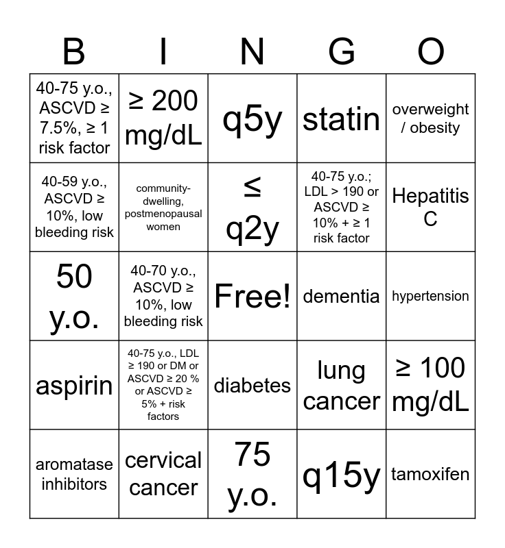 This bingo card has a free space and 65 words: q3y, ≥ 5.7%, ≥ 6.5%, ≥ 100 mg/dL, ≥ 126 mg/dL, ≥ 140 mg/dL, ≥ 200 mg/dL, cardiovascular disease, ≤ q2y, q1y, diabetes, dyslipidemia, hypertension, overweight / obesity, tobacco use, 40-59 y.o., ASCVD ≥ 10%, low bleeding risk, 40-70 y.o., ASCVD ≥ 10%, low bleeding risk, 40-75 y.o., ASCVD ≥ 7.5%, ≥ 1 risk factor, ≥ 40 y.o.; LDL ≥ 190 or DM or ASCVD ≥ 20 % or ASCVD ≥ 5% + risk factors, 40-75 y.o.; LDL > 190 or ASCVD ≥ 10% + ≥ 1 risk factor, 40-75 y.o., LDL ≥ 190 or DM or ASCVD ≥ 20 % or ASCVD ≥ 5% + risk factors, aspirin, statin, hormone therapy, 40 y.o., insufficient evidence for screening, q1-2y mammogram based on life expectancy / health status, q1y mammogram, tamoxifen, raloxifene, aromatase inhibitors, breast cancer, ovarian cancer, colorectal cancer, lung cancer, cervical cancer, 65 y.o., 50 y.o., q15y, q2y, community-dwelling, postmenopausal women, women age 55-64 y.o., dementia, depression, anxiety, HIV, Hepatitis C, Hepatitis B, multidose initial series, then 1 dose at 2-6 months, 1 dose; 2 doses (2-6 months apart) if immunocomp, 2 doses, 2-6 months apart, pneumococcal, herpes zoster, 75 y.o., 60 y.o., Timed up and go test, Fracture Risk Assessment Tool, q5y, Gail model, Tyrer-Cuzick model, PREVENT equation, < 60 y.o., 52 y.o., 3% and ≥20%.