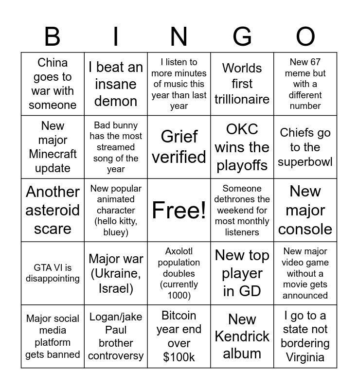This bingo card has a free space and 24 words: Major war (Ukraine, Israel), Logan/jake Paul brother controversy, Grief verified, Major social media platform gets banned, New 67 meme but with a different number, China goes to war with someone, New major Minecraft update, I beat an insane demon, Someone dethrones the weekend for most monthly listeners, Axolotl population doubles (currently 1000), OKC wins the playoffs, Another asteroid scare, New top player in GD, New major video game without a movie gets announced, Bad bunny has the most streamed song of the year, New Kendrick album, New major console, I listen to more minutes of music this year than last year, Chiefs go to the superbowl, New popular animated character (hello kitty, bluey), I go to a state not bordering Virginia, GTA VI is disappointing, Worlds first trillionaire and Bitcoin year end over $100k.