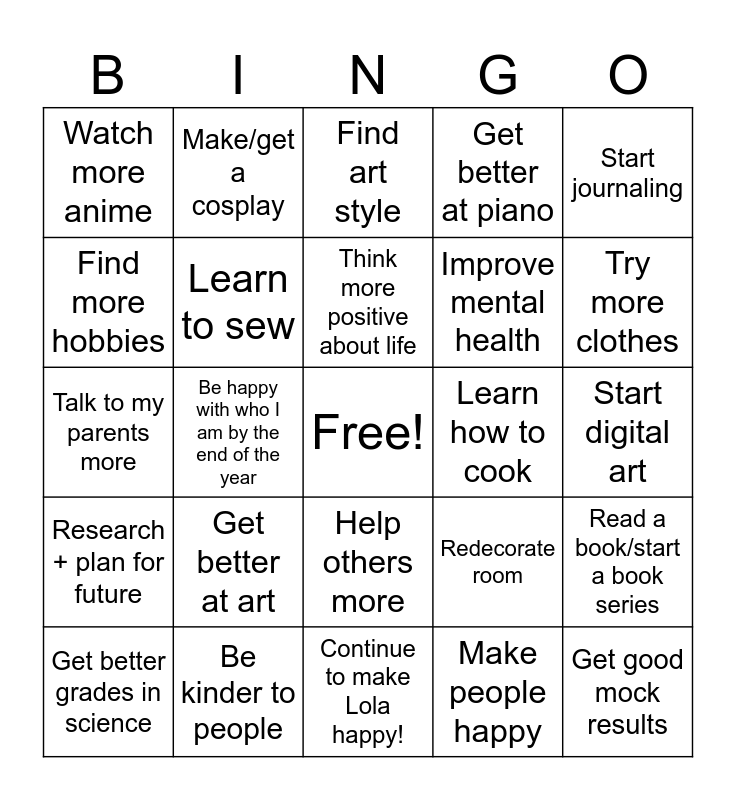 This bingo card has a free space and 24 words: Get better at art, Be kinder to people, Think more positive about life, Get better grades in science, Start journaling, Watch more anime, Find more hobbies, Make/get a cosplay, Learn how to cook, Help others more, Improve mental health, Talk to my parents more, Redecorate room, Read a book/start a book series, Learn to sew, Make people happy, Start digital art, Find art style, Try more clothes, Be happy with who I am by the end of the year, Get good mock results, Research + plan for future, Get better at piano and Continue to make Lola happy!.
