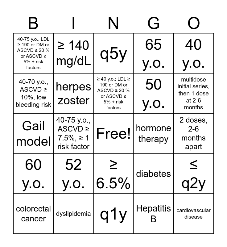 This bingo card has a free space and 65 words: ≥ 20%, 3%, < 60 y.o., ≤ q2y, ≥ 100 mg/dL, ≥ 126 mg/dL, ≥ 140 mg/dL, ≥ 200 mg/dL, ≥ 40 y.o.; LDL ≥ 190 or DM or ASCVD ≥ 20 % or ASCVD ≥ 5% + risk factors, ≥ 5.7%, ≥ 6.5%, 1 dose; 2 doses (2-6 months apart) if immunocomp, 2 doses, 2-6 months apart, 40 y.o., 40-59 y.o., ASCVD ≥ 10%, low bleeding risk, 40-70 y.o., ASCVD ≥ 10%, low bleeding risk, 40-75 y.o., ASCVD ≥ 7.5%, ≥ 1 risk factor, 40-75 y.o., LDL ≥ 190 or DM or ASCVD ≥ 20 % or ASCVD ≥ 5% + risk factors, 40-75 y.o.; LDL > 190 or ASCVD ≥ 10% + ≥ 1 risk factor, 50 y.o., 52 y.o., 60 y.o., 65 y.o., 75 y.o., anxiety, aromatase inhibitors, aspirin, breast cancer, cardiovascular disease, cervical cancer, colorectal cancer, community-dwelling, postmenopausal women, dementia, depression, diabetes, dyslipidemia, Fracture Risk Assessment Tool, Gail model, Hepatitis B, Hepatitis C, herpes zoster, HIV, hormone therapy, hypertension, insufficient evidence for screening, lung cancer, multidose initial series, then 1 dose at 2-6 months, ovarian cancer, overweight / obesity, pneumococcal, PREVENT equation, q1-2y mammogram based on life expectancy / health status, q15y, q1y, q1y mammogram, q2y, q3y, q5y, raloxifene, statin, tamoxifen, Timed up and go test, tobacco use, Tyrer-Cuzick model and women age 55-64 y.o..