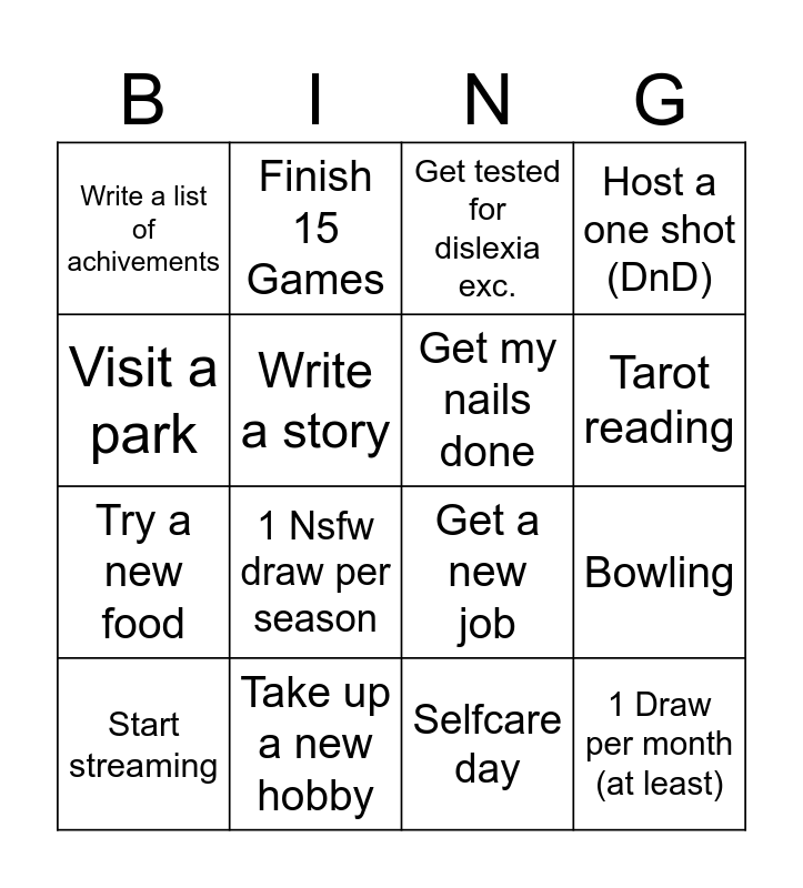 This bingo card has 16 words: Take up a new hobby, Bowling, Get tested for dislexia exc., Write a list of achivements, Try a new food, Finish 15 Games, Get a new job, Selfcare day, Visit a park, Write a story, Start streaming, Host a one shot (DnD), 1 Nsfw draw per season, Tarot reading, Get my nails done and 1 Draw per month (at least).