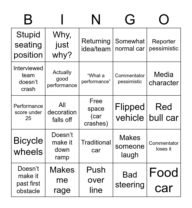 This bingo card has a free space and 29 words: Doesn’t make it past first obstacle, Stuck on obstacle, All decoration falls off, Boring car, Stupid seating position, Returning idea/team, Actually good performance, Doesn’t make it down ramp, Flipped vehicle, Makes me rage, Red bull car, Food car, Push over line, Bad steering, Media character, Makes me cringe, Traditional car, Bicycle wheels, Reporter pessimistic, Performance score under 25, Makes someone laugh, No haybale finish, Commentator pessimistic, Interviewed team doesn’t crash, Somewhat normal car, Why, just why?, Commentator loses it, “What a performance” and “I’ve seen this before”.