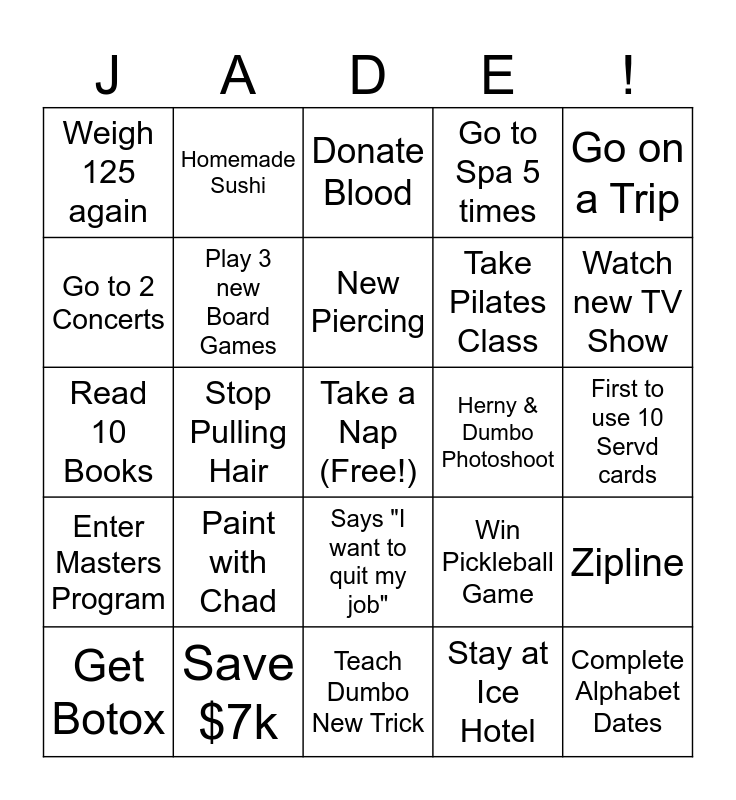 This bingo card has a free space and 24 words: Paint with Chad, Save $7k, New Piercing, Get Botox, Go on a Trip, Weigh 125 again, Go to 2 Concerts, Homemade Sushi, Herny & Dumbo Photoshoot, Says "I want to quit my job", Take Pilates Class, Read 10 Books, Win Pickleball Game, Zipline, Play 3 new Board Games, Stay at Ice Hotel, First to use 10 Servd cards, Donate Blood, Watch new TV Show, Stop Pulling Hair, Complete Alphabet Dates, Enter Masters Program, Go to Spa 5 times and Teach Dumbo New Trick.