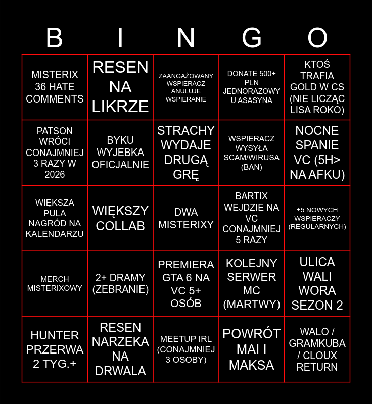 This bingo card has a free space and 24 words: 2+ DRAMY (ZEBRANIE), RESEN NARZEKA NA DRWALA, STRACHY WYDAJE DRUGĄ GRĘ, HUNTER PRZERWA 2 TYG.+, KTOŚ TRAFIA GOLD W CS (NIE LICZĄC LISA ROKO), MISTERIX 36 HATE COMMENTS, PATSON WRÓCI CONAJMNIEJ 3 RAZY W 2026, RESEN NA LIKRZE, BARTIX WEJDZIE NA VC CONAJMNIEJ 5 RAZY, PREMIERA GTA 6 NA VC 5+ OSÓB, WSPIERACZ WYSYŁA SCAM/WIRUSA (BAN), WIĘKSZA PULA NAGRÓD NA KALENDARZU, KOLEJNY SERWER MC (MARTWY), ULICA WALI WORA SEZON 2, BYKU WYJEBKA OFICJALNIE, POWRÓT MAI I MAKSA, +5 NOWYCH WSPIERACZY (REGULARNYCH), ZAANGAŻOWANY WSPIERACZ ANULUJE WSPIERANIE, NOCNE SPANIE VC (5H> NA AFKU), WIĘKSZY COLLAB, WALO / GRAMKUBA / CLOUX RETURN, MERCH MISTERIXOWY, DONATE 500+ PLN JEDNORAZOWY U ASASYNA and MEETUP IRL (CONAJMNIEJ 3 OSOBY).
