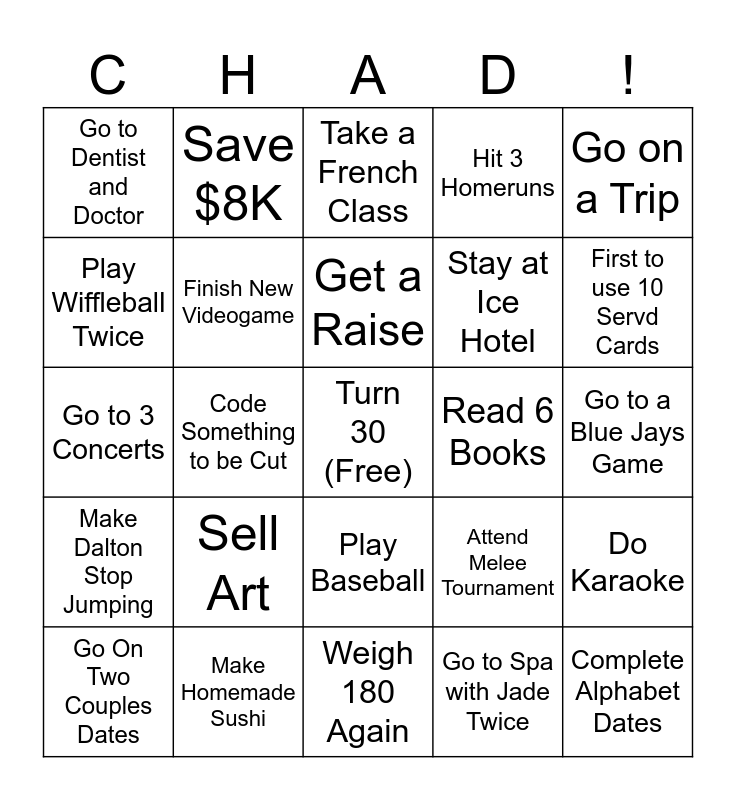 This bingo card has a free space and 24 words: Sell Art, Make Homemade Sushi, Get a Raise, Go On Two Couples Dates, Go on a Trip, Go to Dentist and Doctor, Play Wiffleball Twice, Save $8K, Read 6 Books, Play Baseball, Stay at Ice Hotel, Go to 3 Concerts, Attend Melee Tournament, Do Karaoke, Finish New Videogame, Go to Spa with Jade Twice, Go to a Blue Jays Game, Take a French Class, First to use 10 Servd Cards, Code Something to be Cut, Complete Alphabet Dates, Make Dalton Stop Jumping, Hit 3 Homeruns and Weigh 180 Again.