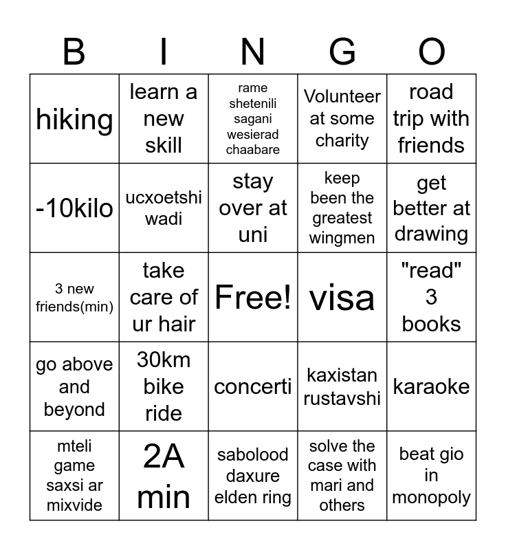 This bingo card has a free space and 24 words: 30km bike ride, 2A min, stay over at uni, mteli game saxsi ar mixvide, road trip with friends, hiking, -10kilo, learn a new skill, visa, concerti, keep been the greatest wingmen, 3 new friends(min), kaxistan rustavshi, karaoke, ucxoetshi wadi, solve the case with mari and others, "read" 3 books, rame shetenili sagani wesierad chaabare, get better at drawing, take care of ur hair, beat gio in monopoly, go above and beyond, Volunteer at some charity and sabolood daxure elden ring.