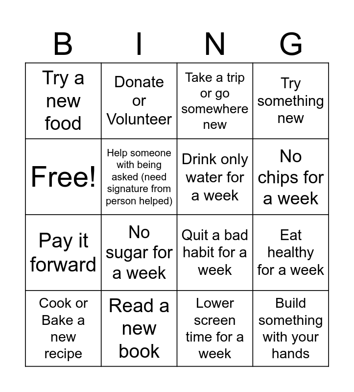 This bingo card has 16 words: Read a new book, Eat healthy for a week, Take a trip or go somewhere new, Try a new food, Pay it forward, Donate or Volunteer, Quit a bad habit for a week, Lower screen time for a week, Free!, Help someone with being asked (need signature from person helped), Cook or Bake a new recipe, Try something new, No sugar for a week, No chips for a week, Drink only water for a week and Build something with your hands.