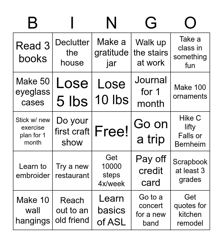 This bingo card has a free space and 24 words: Try a new restaurant, Reach out to an old friend, Lose 10 lbs, Make 10 wall hangings, Take a class in something fun, Read 3 books, Make 50 eyeglass cases, Declutter the house, Go on a trip, Get 10000 steps 4x/week, Journal for 1 month, Stick w/ new exercise plan for 1 month, Pay off credit card, Scrapbook at least 3 grades, Lose 5 lbs, Go to a concert for a new band, Hike Clifty Falls or Bernheim, Make a gratitude jar, Make 100 ornaments, Do your first craft show, Get quotes for kitchen remodel, Learn to embroider, Walk up the stairs at work and Learn basics of ASL.