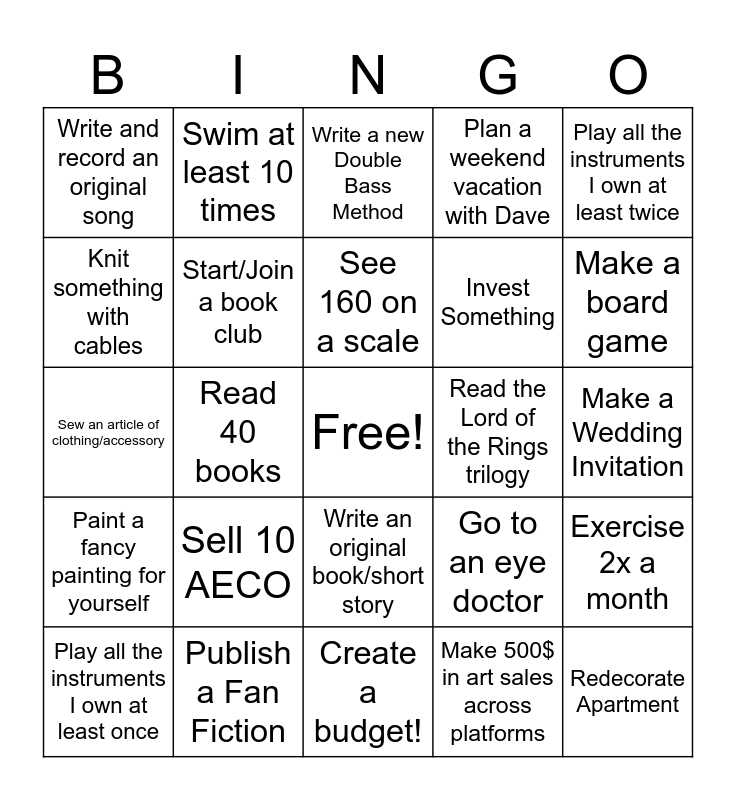 This bingo card has a free space and 24 words: Sell 10 AECO, Publish a Fan Fiction, See 160 on a scale, Play all the instruments I own at least once, Play all the instruments I own at least twice, Write and record an original song, Knit something with cables, Swim at least 10 times, Read the Lord of the Rings trilogy, Write an original book/short story, Invest Something, Sew an article of clothing/accessory, Go to an eye doctor, Exercise 2x a month, Start/Join a book club, Make 500$ in art sales across platforms, Make a Wedding Invitation, Write a new Double Bass Method, Make a board game, Read 40 books, Redecorate Apartment, Paint a fancy painting for yourself, Plan a weekend vacation with Dave and Create a budget!.