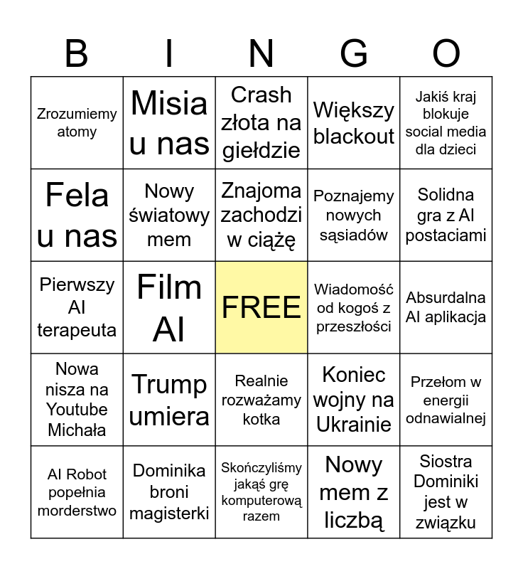 This bingo card has a free space and 24 words: Trump umiera, Dominika broni magisterki, Znajoma zachodzi w ciążę, AI Robot popełnia morderstwo, Jakiś kraj blokuje social media dla dzieci, Zrozumiemy atomy, Fela u nas, Misia u nas, Wiadomość od kogoś z przeszłości, Realnie rozważamy kotka, Poznajemy nowych sąsiadów, Pierwszy AI terapeuta, Koniec wojny na Ukrainie, Przełom w energii odnawialnej, Nowy światowy mem, Nowy mem z liczbą, Absurdalna AI aplikacja, Crash złota na giełdzie, Solidna gra z AI postaciami, Film AI, Siostra Dominiki jest w związku, Nowa nisza na Youtube Michała, Większy blackout and Skończyliśmy jakąś grę komputerową razem.