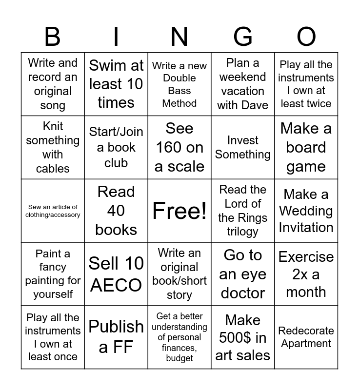 This bingo card has a free space and 24 words: Sell 10 AECO, Publish a FF, See 160 on a scale, Play all the instruments I own at least once, Play all the instruments I own at least twice, Write and record an original song, Knit something with cables, Swim at least 10 times, Read the Lord of the Rings trilogy, Write an original book/short story, Invest Something, Sew an article of clothing/accessory, Go to an eye doctor, Exercise 2x a month, Start/Join a book club, Make 500$ in art sales, Make a Wedding Invitation, Write a new Double Bass Method, Make a board game, Read 40 books, Redecorate Apartment, Paint a fancy painting for yourself, Plan a weekend vacation with Dave and Get a better understanding of personal finances, budget.