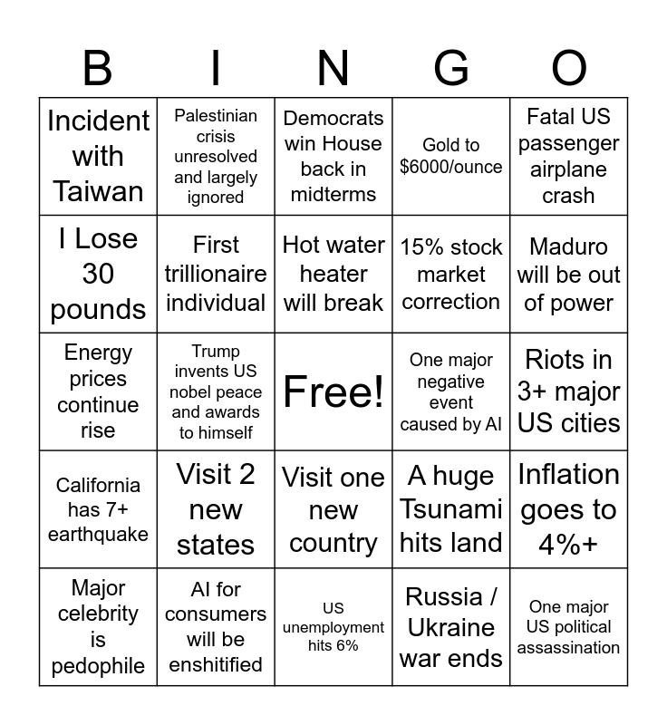 This bingo card has a free space and 24 words: Visit 2 new states, AI for consumers will be enshitified, Hot water heater will break, Major celebrity is pedophile, Fatal US passenger airplane crash, Incident with Taiwan, I Lose 30 pounds, Palestinian crisis unresolved and largely ignored, One major negative event caused by AI, Visit one new country, 15% stock market correction, Energy prices continue rise, A huge Tsunami hits land, Inflation goes to 4%+, First trillionaire individual, Russia / Ukraine war ends, Riots in 3+ major US cities, Democrats win House back in midterms, Maduro will be out of power, Trump invents US nobel peace and awards to himself, One major US political assassination, California has 7+ earthquake, Gold to $6000/ounce and US unemployment hits 6%.