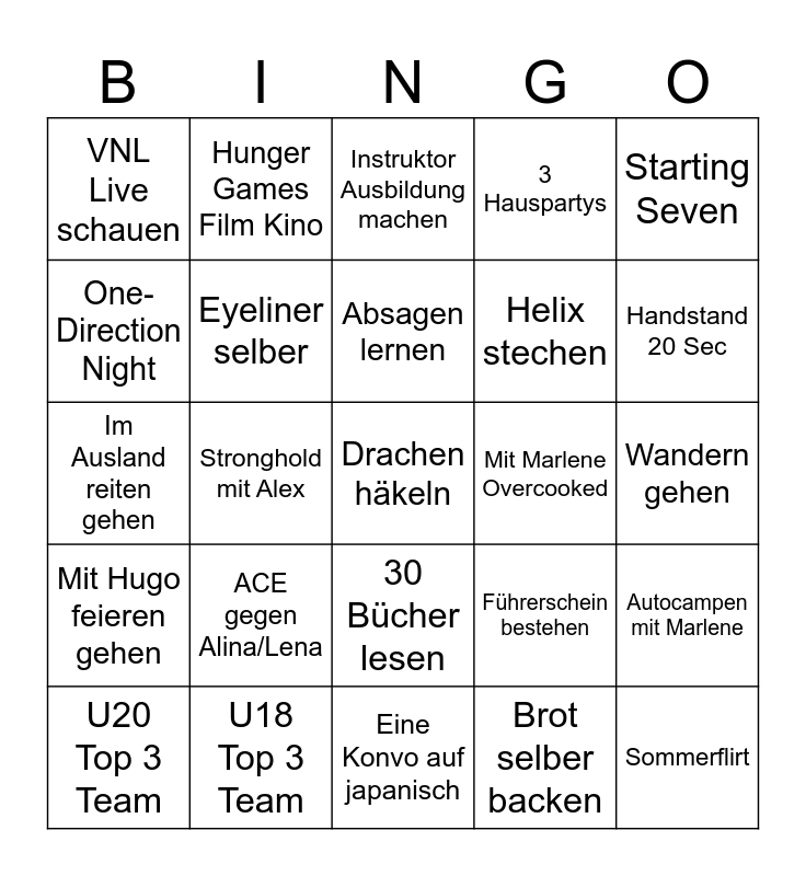 This bingo card has 25 words: ACE gegen Alina/Lena, Eine Konvo auf japanisch, Absagen lernen, U20 Top 3 Team, Starting Seven, VNL Live schauen, One-Direction Night, Hunger Games Film Kino, Mit Marlene Overcooked, 30 Bücher lesen, Helix stechen, Im Ausland reiten gehen, Führerschein bestehen, Autocampen mit Marlene, Eyeliner selber, Sommerflirt, Wandern gehen, Instruktor Ausbildung machen, Handstand 20 Sec, Stronghold mit Alex, Drachen häkeln, U18 Top 3 Team, Mit Hugo feieren gehen, 3 Hauspartys and Brot selber backen.