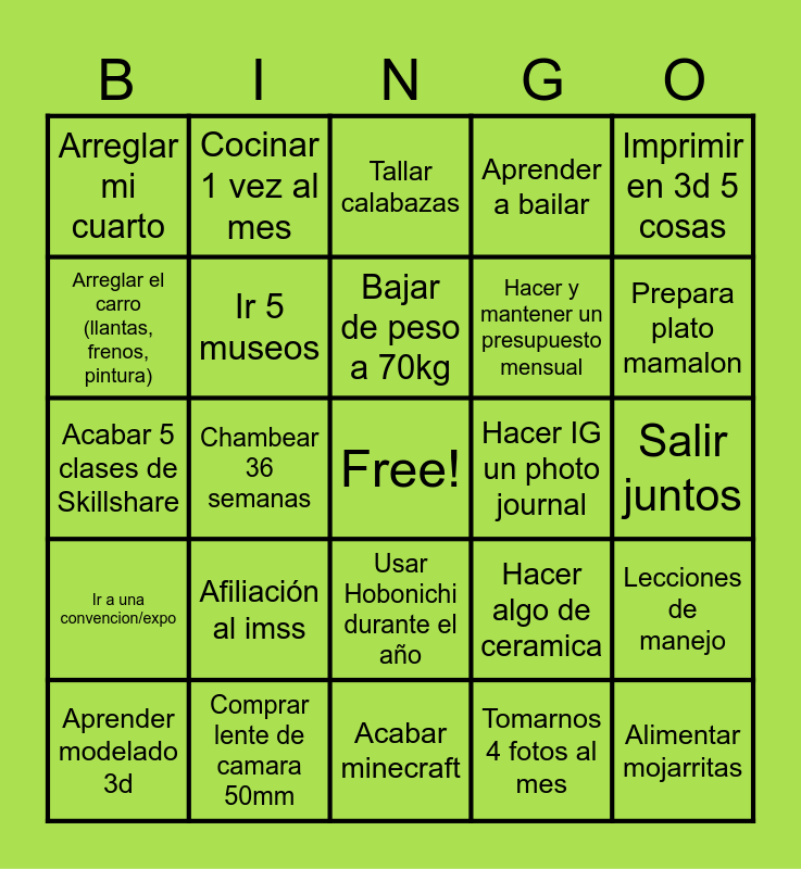 This bingo card has a free space and 24 words: Afiliación al imss, Comprar lente de camara 50mm, Bajar de peso a 70kg, Aprender modelado 3d, Imprimir en 3d 5 cosas, Arreglar mi cuarto, Arreglar el carro (llantas, frenos, pintura), Cocinar 1 vez al mes, Hacer IG un photo journal, Usar Hobonichi durante el año, Hacer y mantener un presupuesto mensual, Acabar 5 clases de Skillshare, Hacer algo de ceramica, Lecciones de manejo, Ir 5 museos, Tomarnos 4 fotos al mes, Salir juntos, Tallar calabazas, Prepara plato mamalon, Chambear 36 semanas, Alimentar mojarritas, Ir a una convencion/expo, Aprender a bailar and Acabar minecraft.
