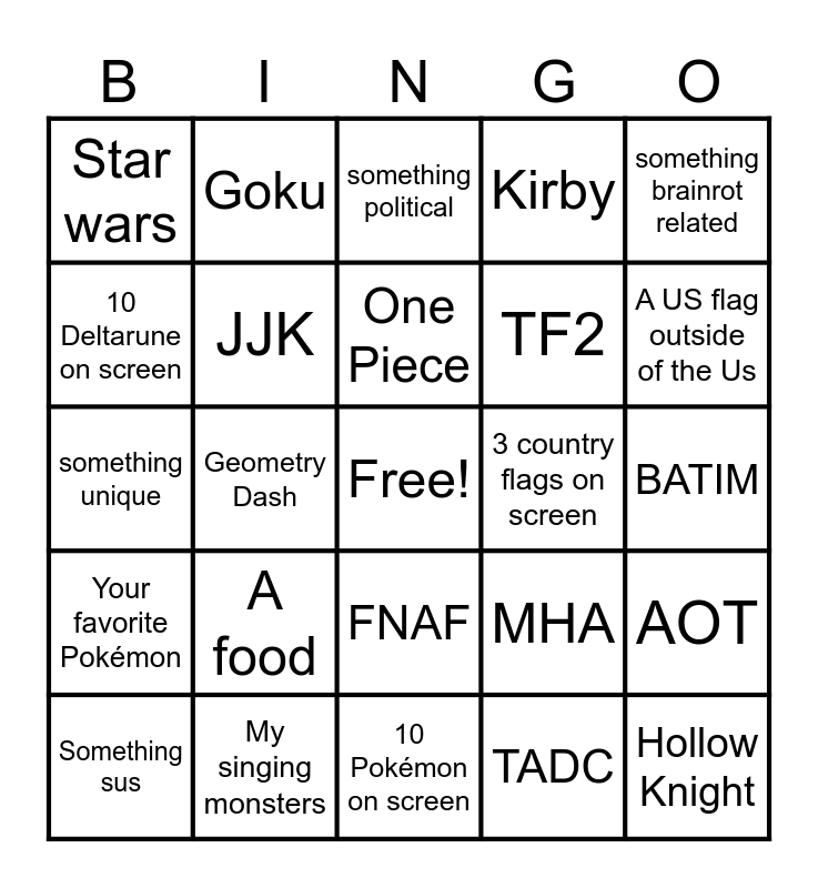 This bingo card has a free space and 25 words: A food, 10 Pokémon on screen, One Piece, Something sus, something brainrot related, Star wars, 10 Deltarune on screen, Goku, 3 country flags on screen, FNAF, TF2, something unique, MHA, AOT, JJK, Hazbin Hotel, BATIM, something political, A US flag outside of the Us, Geometry Dash, Hollow Knight, My singing monsters, Your favorite Pokémon, Kirby and TADC.